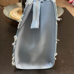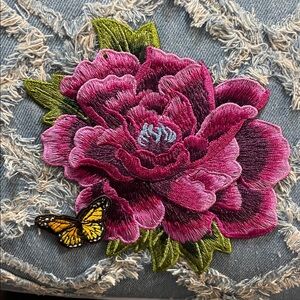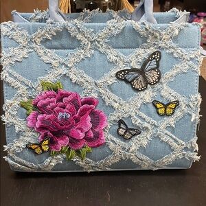 NWOT Embroidered Denim Tote Bag with Floral and Butterfly Design