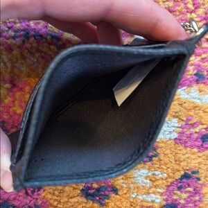 This stylish black card holder features a sleek and compact design. The accessory includes a silver-toned chain attachment, adding both functionality and a touch of elegance. Perfect for keeping your essential cards and keys secure and easily accessible.