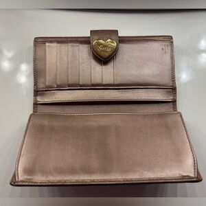 This is a Gucci Guccissima leather bifold long wallet with a heart-shaped snap closure.