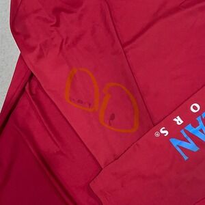 Conquer the great outdoors in this vibrant red Magellan Outdoors long sleeve shirt. Designed for the avid angler, its classic fit ensures comfortable movement whether you're casting a line or enjoying a day on the water. The moisture-wicking fabric keeps you cool and dry, allowing you to focus on the thrill of the catch. Showcasing bold blue "Magellan Outdoors" graphics down the sleeve, this shirt is perfect for a day of fishing, a casual weekend outing, or exploring new trails. Two small stains are circled/noted in photos.