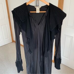 Comme des Garçons Black Dress. Smooth black satiny long sleeved dress with a 100% wool collar and sleeve cuffs.