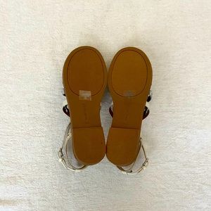 Black white and silver flat sandals with faux leather straps and adjustable buckle closure. Brand new in the box - never been worn.