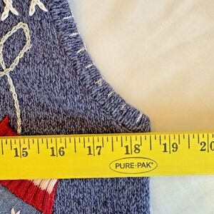 Get ready for the holiday season with this beautiful Bobbie Brooks sweater vest. Made from a blend of ramie and cotton, this tight-knit vest features a V-neckline and zipper closure. The blue color and patriotic theme make it perfect for travel, parties, or casual wear. The vest is adorned with crochet, tasseled, and embroidered accents, adding a touch of elegance to the classic design. It is breathable and comes in a regular fit, making it suitable for all seasons. Hand wash only to maintain the quality of the fabric. Get this unit now and add a touch of holiday magic to your wardrobe.