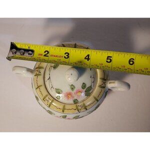 Vintage Hand Painted Japanese Porcelain sugar bowl & creamer. Delicate pink flowers and lime green foliage. The sugar bowl is 4 inches high with the lid and 6 inches wide at the handles.