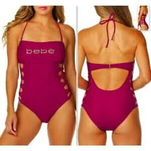 Iconic bebe Y2K-era one-piece swimsuit in a bold hot pink / magenta shade with a rhinestone “bebe” logo across the bust. Features a flattering strapless bandeau silhouette, adjustable halter tie, and dramatic side cutouts with criss-cross strap detailing for a snatched, curve-enhancing fit.