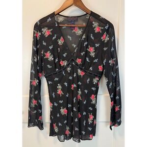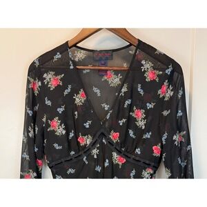 Vintage RALPH by Ralph Lauren sheer black tunic with a romantic whimsigoth / fairy / witchy aesthetic. Fully sheer with an allover red rose floral design. Features a babydoll silhouette with a v-neckline edged in velvet ribbon and lace trim. Designed with sheer flared long sleeves for movement and drama. Rare vintage piece with a delicate, ethereal look.