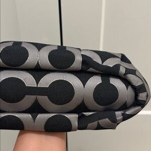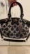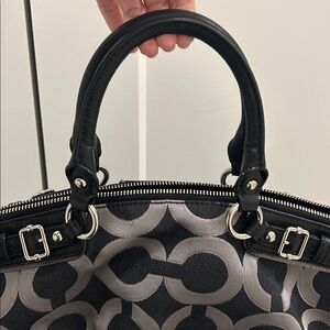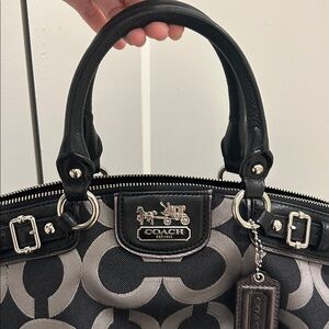 Stylish Coach satchel with signature pattern. Features black and silver tones. Perfect for any outfit.
