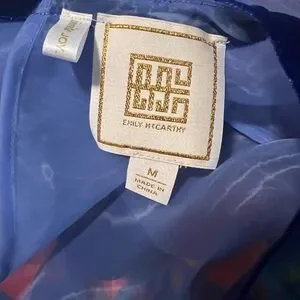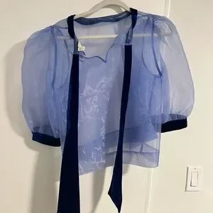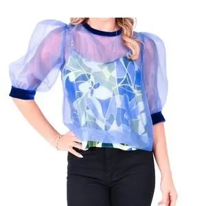 Elegant sheer blouse with puff sleeves. Features a deep blue velvet trim.