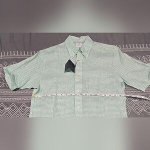 Brand new with tags. Size medium. Regent style. Button down style. Collared. Green and white gingham print. Made with Baird McNutt Irish linen. Measurements and fabric content listed above in pictures.
