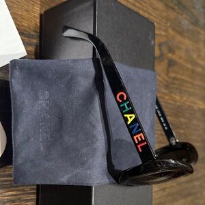 Stylish CHANEL sunglasses with a glossy black finish. Perfect for a chic look, Chanel name in fun colors on the sides. Protective case, bag, box and tags included.