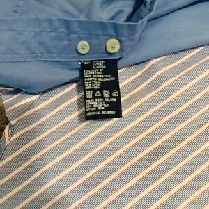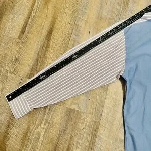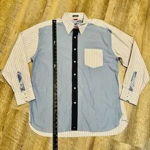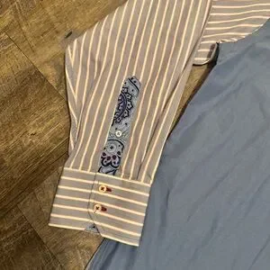 Elevate your wardrobe with this unique Tommy Hilfiger men’s button-down shirt featuring a standout patchwork design. This shirt combines solid light blue panels with striped sleeves, contrast placket, paisley interior accents, and classic Hilfiger detailing. A stylish, high-quality piece that works great for casual wear, business casual, or smart layering.