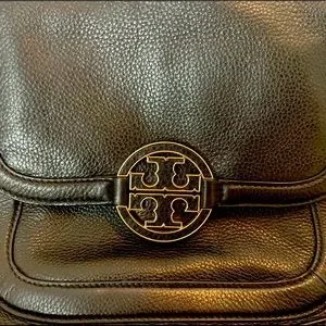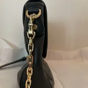 Sleek black leather crossbody. Gold chain strap adds elegance. Signature Tory Burch emblem on flap.