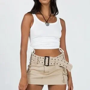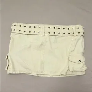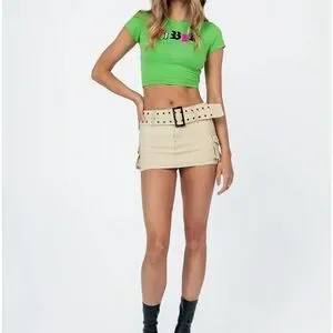 Chic tan mini skirt. Features stylish belt and pocket details. Perfect for casual wear.