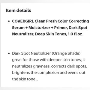 New in the box. Neutralize dark spots with COVERGIRL's Color Correcting Serum Moisturizer Primer. Ideal for sensitive skin. Vegan and cruelty-free. Please see photos for additional product details.