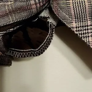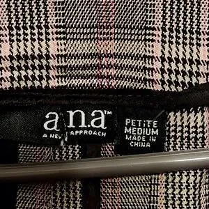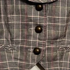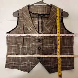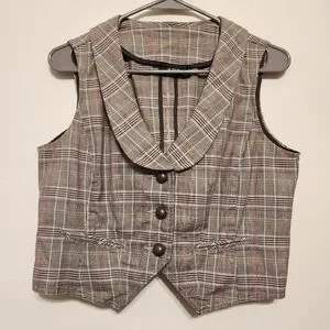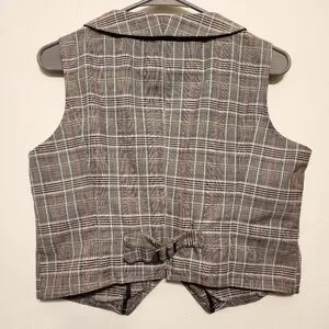 Ana Plaid Vest. Buckle at back so it can be cinched in a bit. Has front pockets which are still stitched shut.