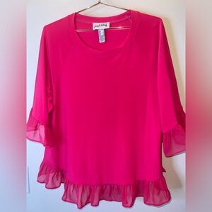 Beautiful Joseph Ribkoff blouse in a vibrant hot pink shade. Features flutter sleeves with sheer ruffle trim and a layered ruffle hem for an elegant, feminine silhouette. A perfect statement piece for work, dinner, or special occasions.