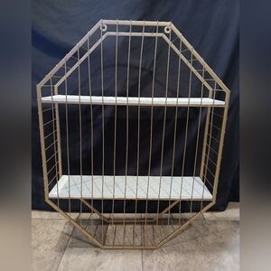 Enhance your home decor with this stylish geometric wall shelf. Featuring a sleek gold frame and elegant white shelves, it's perfect for displaying your favorite items.