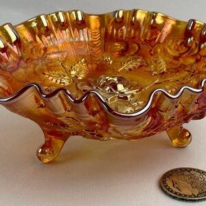 It features an iridescent orange, or marigold, finish typical of carnival glass.