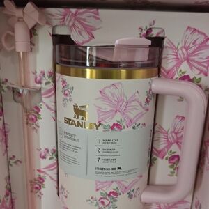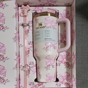 Stanley Pink Tumbler with floral design - Quencher H2.0. Includes large handle and a pink straw with a bow straw topper. Comes in a beautiful branded box and has a velvety cloth carrying bag. 40oz., brand new. Perfect for all-day hydration. Keeps your drink cold for 11 hours and hot for 7 hours. Features include: 3-position lid, stainless steel, splash proof, dishwasher safe, double-wall vacuum insulation, reusable straw, and car cup holder compatible. This one is beautiful!