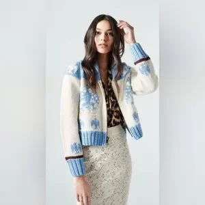Chic cowl neck sweater with bold patterns. Features a stylish zip front. Ideal for layering.