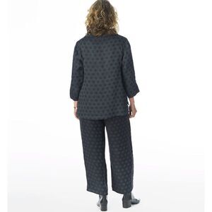 Created in our finely woven jacquard linen wool blend, these pants are a slightly cropped wide leg pant with a flat front, elasticized adjustable back waistline to adjust fit, side seam pockets and a hidden side zipper.