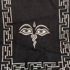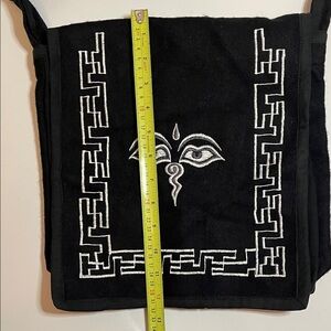 Buddha Eyes Embroidered Bag with zipper closure under Front button flap, additional zipped pocket beneath flap, adjustable cross-body shoulder strap. Buddha Eyes represent Love and Compassion for all beings.