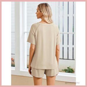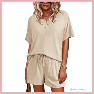 Style: Two-piece lounge set with short sleeve top and elastic waist shorts