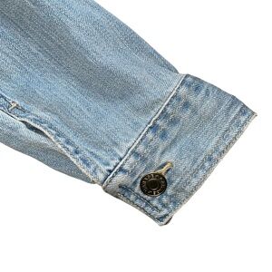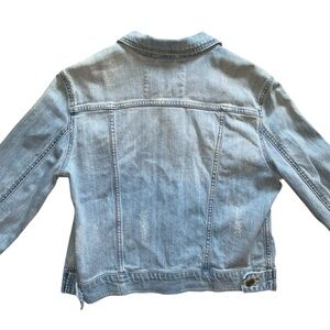 Garage sky blue lightly distressed denim jean jacket. Clean and in excellent pre-worn condition, only worn a handful of times. Size large measuring approximately 19.5" ptp and 20.5" total length