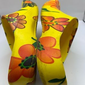 Bright yellow mules with colorful floral design. Comfortable and stylish.