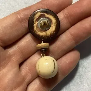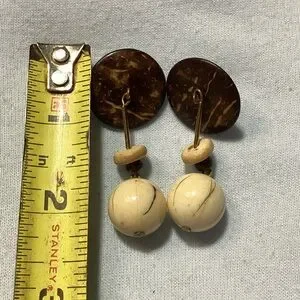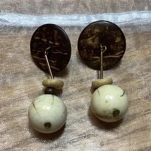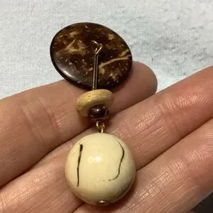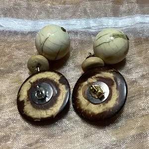 These boho dangle earrings feature a beautiful combination of brown and cream tones, in wooden and plastic pieces. For pierced ears. They are about 2" long. Lightweight. One back is gold colored and one is silver colored.