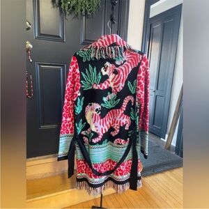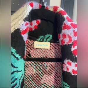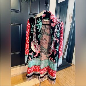 Essitam patterned knit jacket in a bold multicolor design with red, teal, black, and cream tones. Features an open-front silhouette with a removable self-tie belt and fringe hem detailing. Statement layering piece with a cozy structured knit feel. Easy to style over denim, dresses, or simple basics for a standout look.
