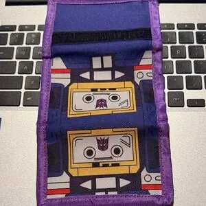 Vibrant purple pouch with a unique graphic design featuring yellow and blue accents. Pre loved exclusive Lootcrate Soundwave Transformers Purple and Yellow wallet sold as is in guc