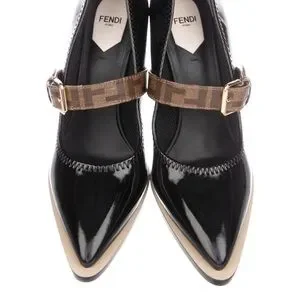 Elegant black heels with brown Fendi logo strap. Sleek and stylish design.