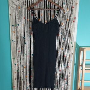 It features a smocked (stretchy) waistband for a flattering fit, a tie detail at the center of the bust, and spaghetti straps.
