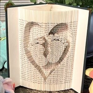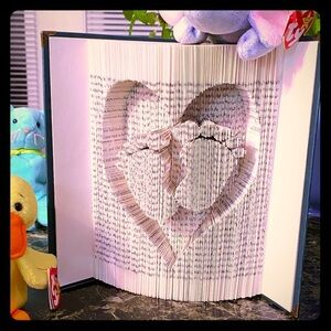 Upcycling books to art! This is a 400+ page book where each page is very precisely measured, cut and folded to create baby feet within a heart. Each corner has a decorative metal protector, adding to this items beauty.