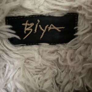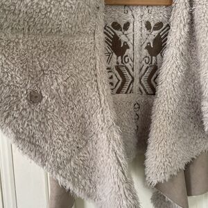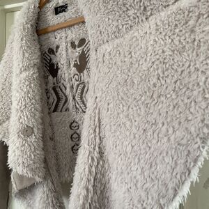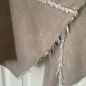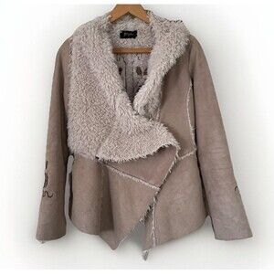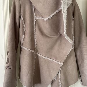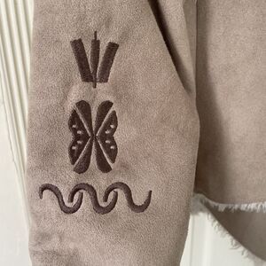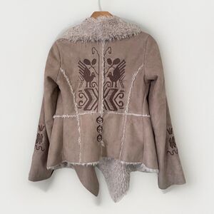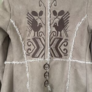Embroidered design on back and on sleeves. Tan with brown embroidery and white faux fur lining.