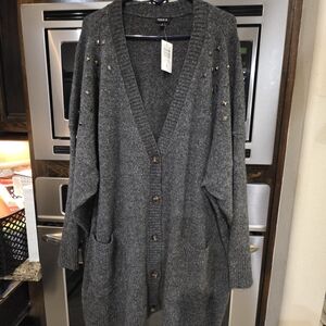Chic charcoal cardigan with stylish embellishments. Perfect for layering and adding flair.Product Details