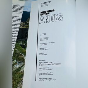 Museums of the Andes Hardcover Book. Shows and describes pottery, fabrics, tapestries, sculpture, carvings, and other artifacts produced in pre-Columbian Peru. Published in 1981 by Newsweek & Kodansha Tokyo. Printed and bound in Japan. Please Note: Exact and accurate colour of item may vary due to lighting sources or different devices settings. I use little editing to reflect items as they are New to Poshmark? Use invite code JAZZELLARAY when registering your account to get a $15 credit toward your first purchase!