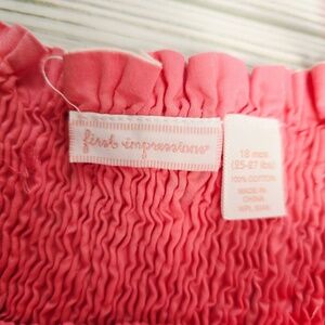 Charming pink dress with floral design. Features smocked bodice and straps.
