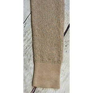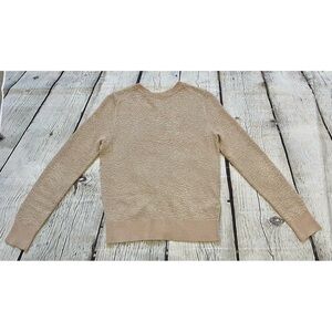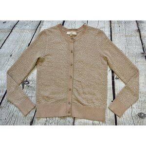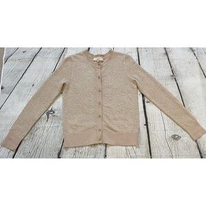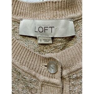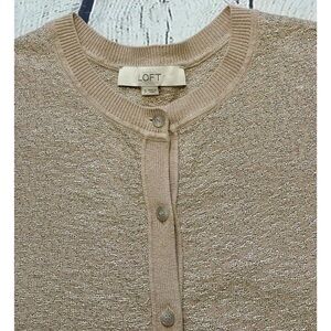 Loft light beige cardigan sweater with metallic gold accent threading throughout, creates the perfect champagne gold color. Front button closure. Ribbed knit collar, sleeve cuffs, & bottom hem.