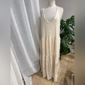 Effortless and breezy cream maxi dress featuring a flattering deep V-neckline, lightweight textured fabric, and flowy tiered silhouette. The open back with adjustable halter-style ties and double shoulder straps makes it perfect for warm weather or a relaxed boho look.