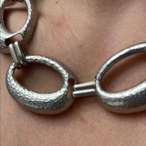 This striking silver necklace showcases a series of large, textured oval links that form a bold and eye-catching chain. Its minimalist design and industrial finish make it a standout piece for any occasion.