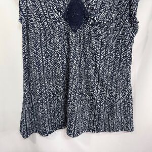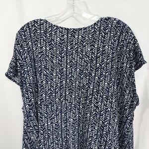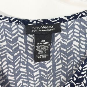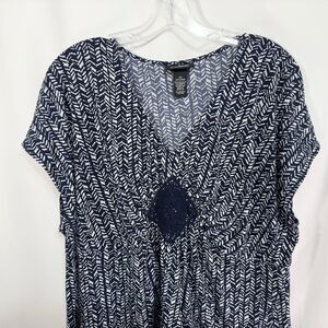 Catherines 2X top, plus size 22/24W blouse, navy and white print top, boho-inspired women’s top, relaxed fit tunic top, lightweight plus size top, V-neck casual blouse, Catherines plus size clothing, comfortable everyday wear, stylish printed top 2X, empire waist detail blouse, breathable flowy top, versatile boho chic top, plus size casual fashion, Catherines women’s tunic.