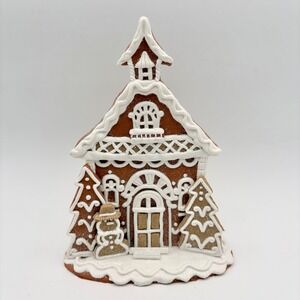 A charming gingerbread house Christmas decoration adorned with white icing details, a friendly snowman, and festive trees. This delightful piece captures the magic of a winter village scene, perfect for adding a touch of holiday cheer to your home. Display it on a mantelpiece, shelf, or as part of a larger holiday display. Ideal for creating a cozy Christmas atmosphere or as a festive accent during holiday gatherings.