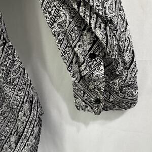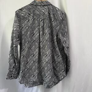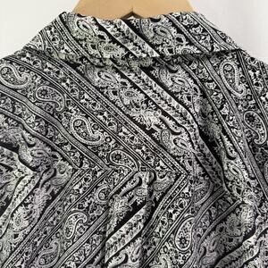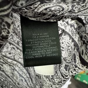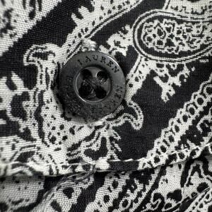 The Lauren Ralph Lauren Paisley Cotton Silk Blend Button Front Long Sleeve in size 1X is a stylish and versatile top suitable for various occasions such as travel, parties, casual wear, and business meetings. Made from a lightweight and breathable chiffon fabric blend of silk and cotton, this oversized button-up features a classic collared neckline and long sleeves, making it perfect for all seasons. The elegant paisley pattern in black adds a touch of sophistication, while the relaxed fit and designer brand ensure a timeless and chic look. Easy to care for with machine washable instructions, this top is a must-have for any woman.