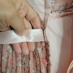 This vintage maxi dress is a cottagecore dream -- browns, pinks, dusty blue with printed ruffle detail -- semi-sheer, the top layer floats over a pink taffeta lining. Gorgeous piece for a dance or other special event.