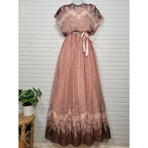 Vtg 70s maxi dress floral overlay brown pink size XS cottagecore boho