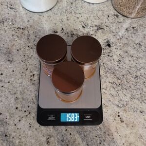 Set of three Vanilla Cinnamon Brûlée candles in glass jar with brown metal suction lids. Perfect for adding a warm, inviting scent to any room.
