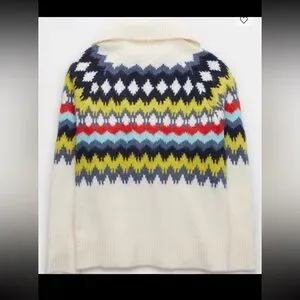 Beautiful, thick knit sweater in Aerie’s signature “Real Good” recycled yarns. Features a collared neckline with quarter-zip front, long sleeves, and colorful Fair Isle pattern in cream, navy, red, yellow, and blue tones. Soft, warm, and perfect for winter or chilly fall days. Slightly oversized relaxed fit for comfort and layering.