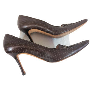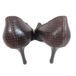 Brown leather pumps with laser cut dots and raised stitching on the toe area
